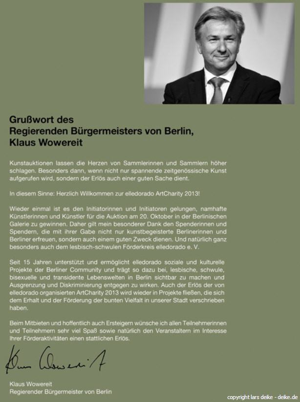 Kunstauktionen lassen deie Herzen von Sammlerinnen und Sammlern höher schlagen. Besonders dann, wenn nicht nur spannende zeitgenössische Kunst aufgefufen wird, sondern der Erlös auch einer guten Sache dient. In diesem Sinne: Herzlich Willkommen zur elledorado ArtCharity 2013! Wieder einmal ist es den Initiatoren und Initiatorinnen gelungen, namhafte Künstlerinnen und Künstler für die Aukton am 20. Oktober in der Berlinischen Galerie zu gewinnen. Daher gilt mein besonderer Dank den Spenderinnen und Spendern, die mit ihrer Gabe nicht nur kunstbegeisterte Berlinerinnen und Berliner erfreuen, sondern auch einem guten Zweck dienen. Und natürlich ganz besonders auch dem lesbisch-schwulen Förderkreis elledorado e.V. Seit 15 Jahren unterstützt und ermöglicht elledorado soziale und kulturelle Projekte der Berliner Community und trägt so dazu bei, lesbische, schwule bisexuelle und transidente Lebenswelten in berlin sichtbar zu machen und Ausgrenzung und Diskriminierung entgegen zu wirken. Auch der Erlös der von elledorado organiesierten ArtCharity 2013 wird wieder in Projekte fließen, die sich dem Erhalt und der Förderung der bunten Vielfalt in unserer Stadt verschrieben haben. Beim Mitbieten und hoffentlich auch Ersteigern wünsche ich allen Teilnehmern und Teilnehmerinnen sehr viel Spass sowie natürlich den Veranstaltern im Interesse Ihrer Förderaktivitäten einen stattlichen Erlös.